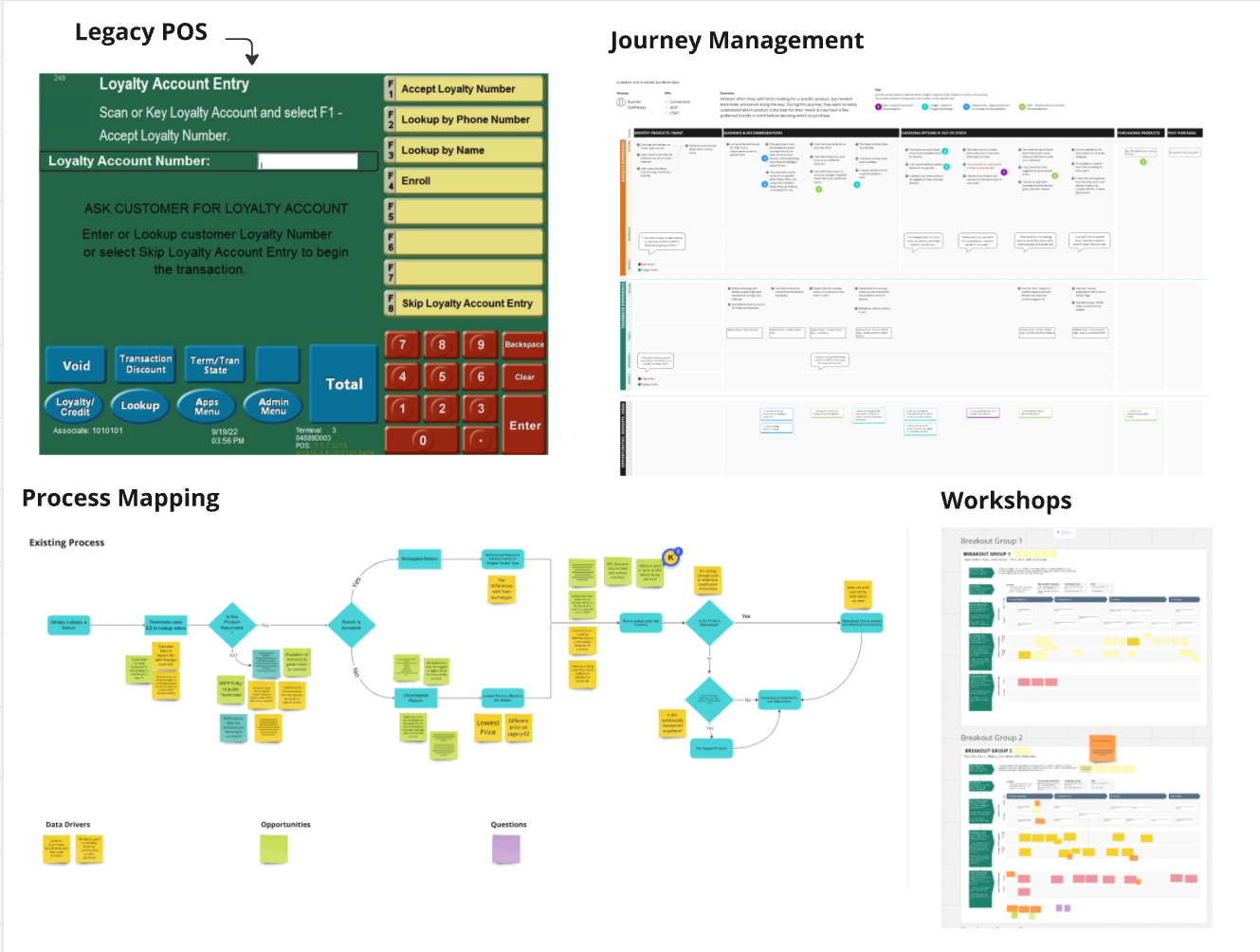 To tackle this challenge, I focused on understanding the needs and priorities of the project. Below, you can see some of the methods I used to organize and align our efforts, including journey maps, planning boards, user flows, and collaborative workshops. These tools helped ensure we were designing thoughtful, scalable solutions that met both immediate needs and future goals.